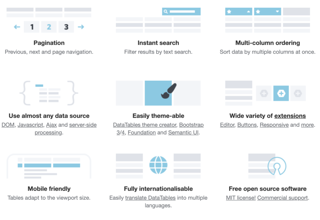 DataTables is a plug-in for the jQuery Javascript library. It is a highly flexible tool, built upon the foundations of progressive enhancement, that adds all of these advanced features to any HTML table. DataTables is a powerful Javascript library for adding interaction features to HTML tables, and while simplicity is a core design principle for the project as a whole, it can appear quite daunting to get started.